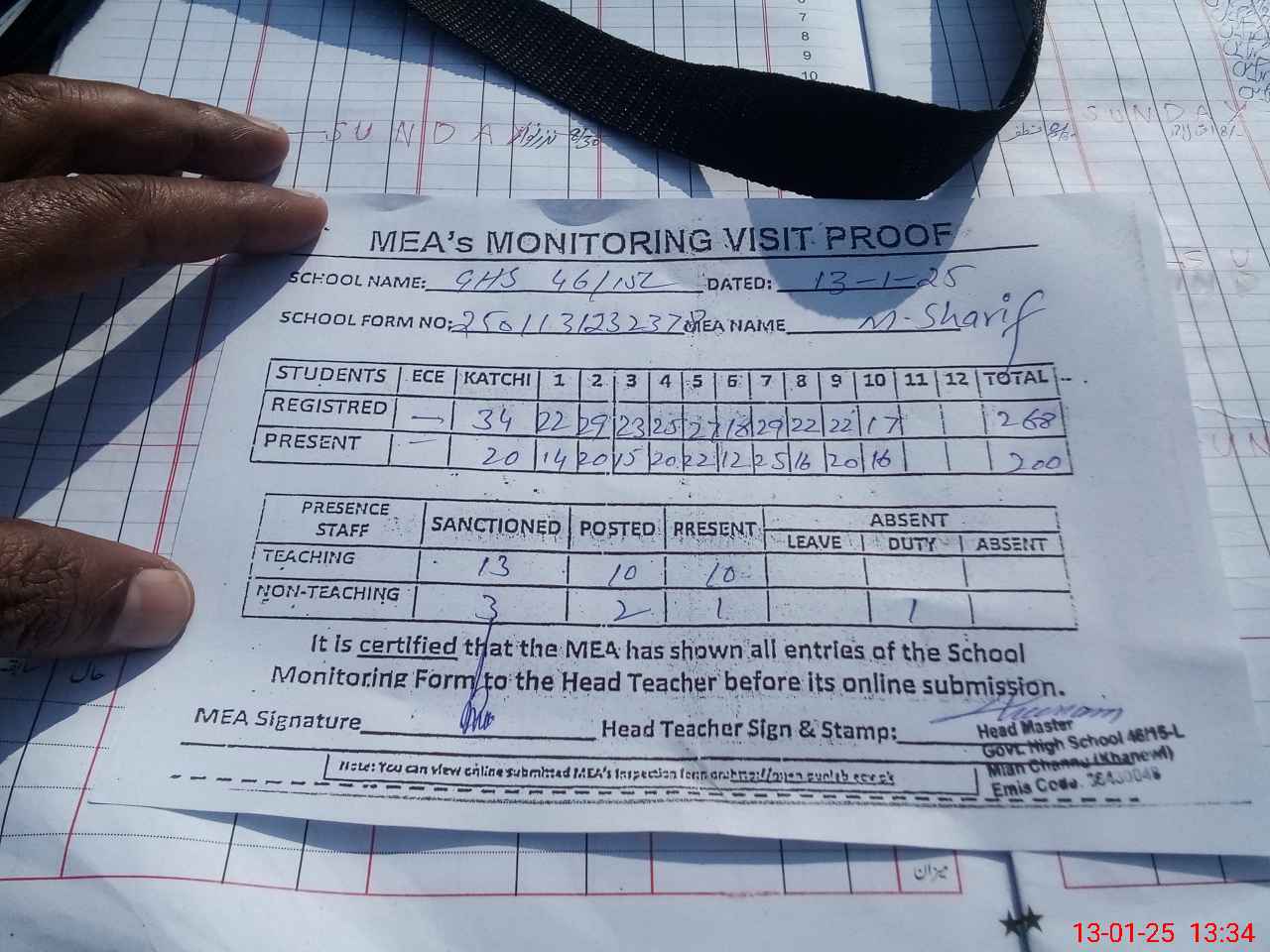 | Attendance Register | Head Teacher | MEA with School | Visit Proof |