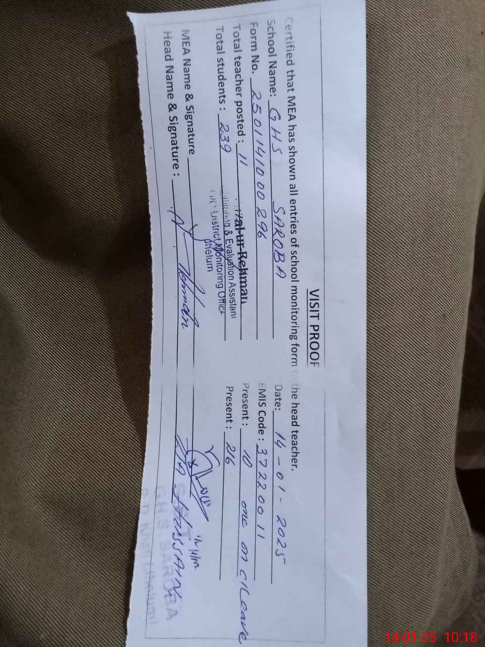 | Attendance Register | Head Teacher | MEA with School | Visit Proof |