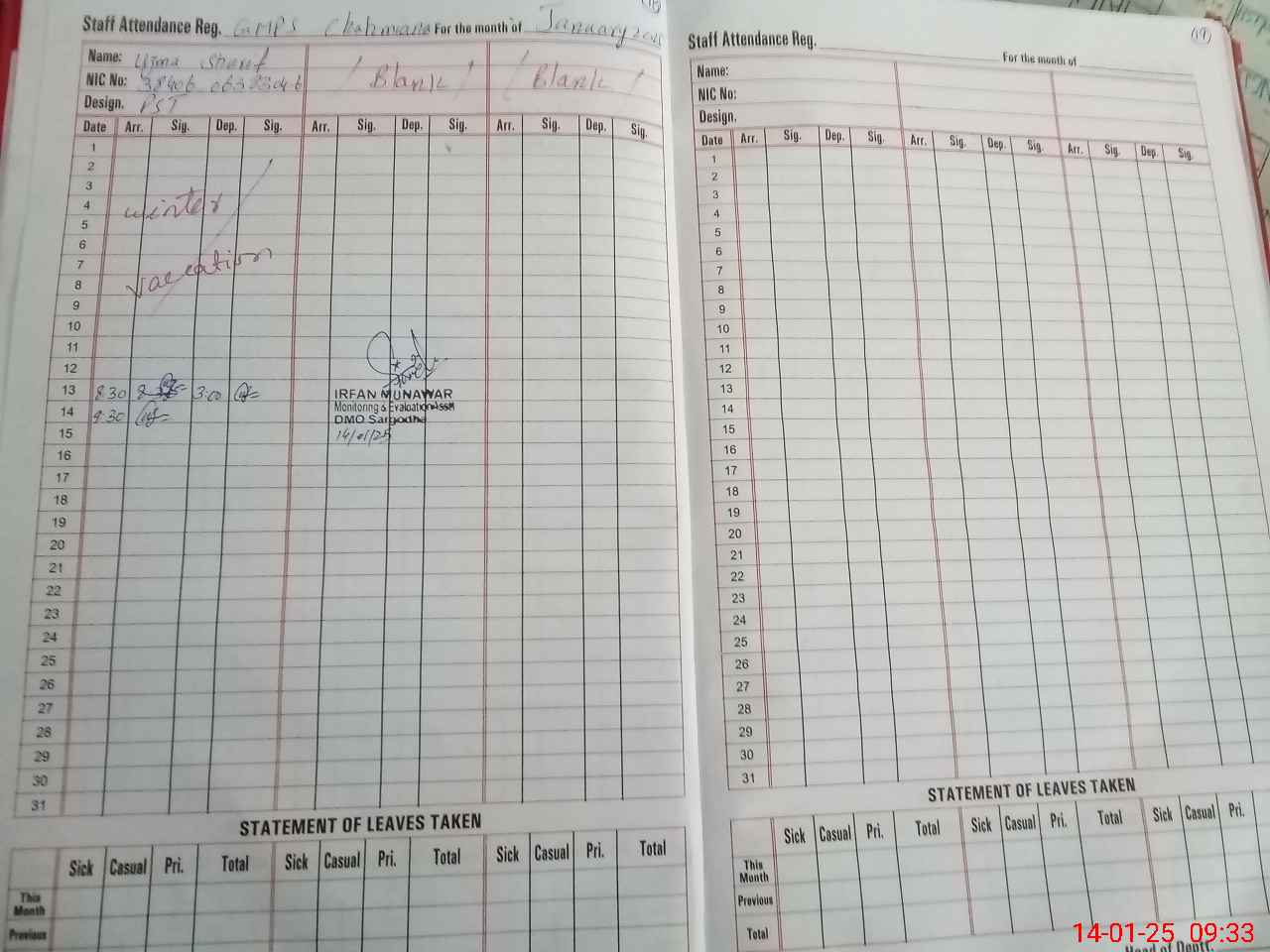 | CNIC | Full Name | Designation | R/C | Absence During Last Calender Month |