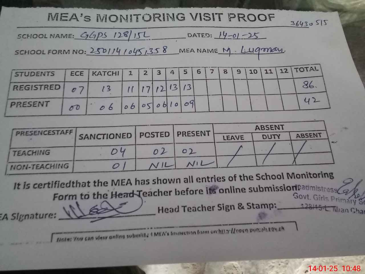 | Attendance Register | Head Teacher | MEA with School | Visit Proof |