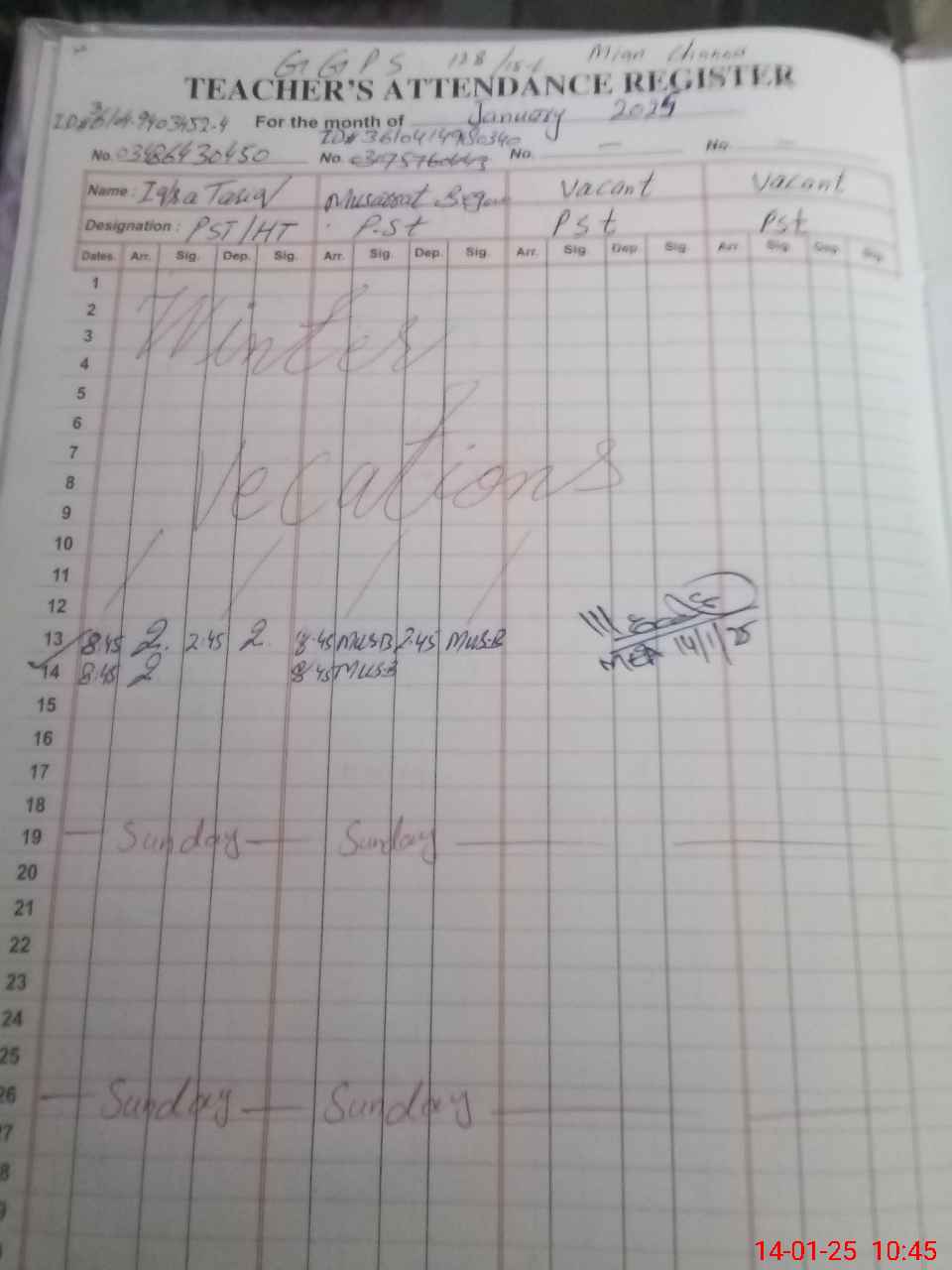 | Name: Iq**** Ta**** Designation: (School Headmaster's/Headmistress's) PST Phone/Cell Number: 03**** |