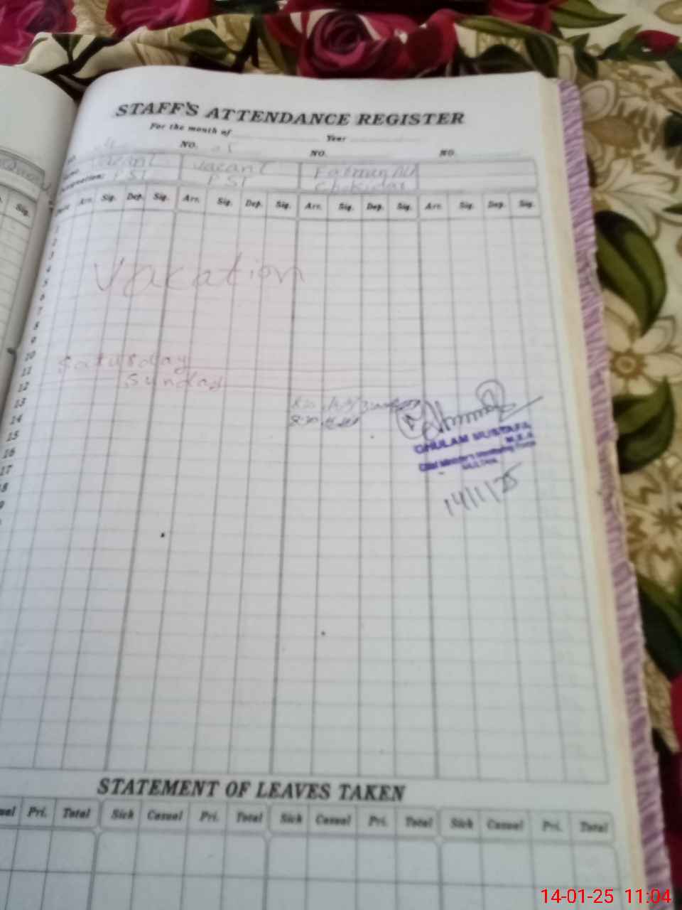 | CNIC | Full Name | Designation | R/C | Absence During Last Calender Month |