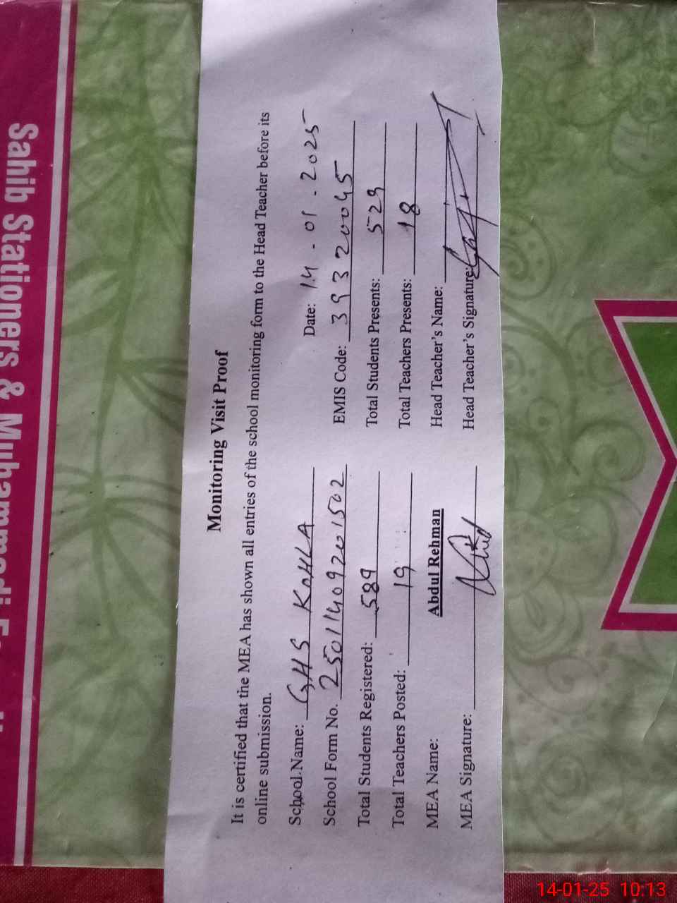| Attendance Register | Head Teacher | MEA with School | Visit Proof |