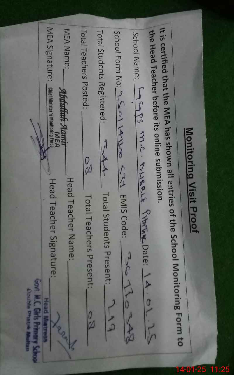 | EMIS Code: 36110348 | Name of School: GGPS MC DOUBLE PHATAK MULTAN | |||