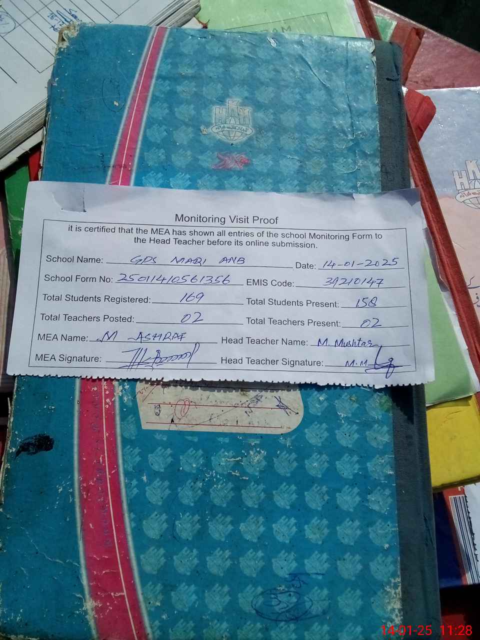| Attendance Register | Head Teacher | MEA with School | Visit Proof |