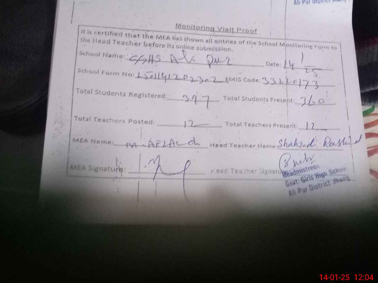 | EMIS Code: 33220173 | Name of School: GGHS ALI PUR | |||