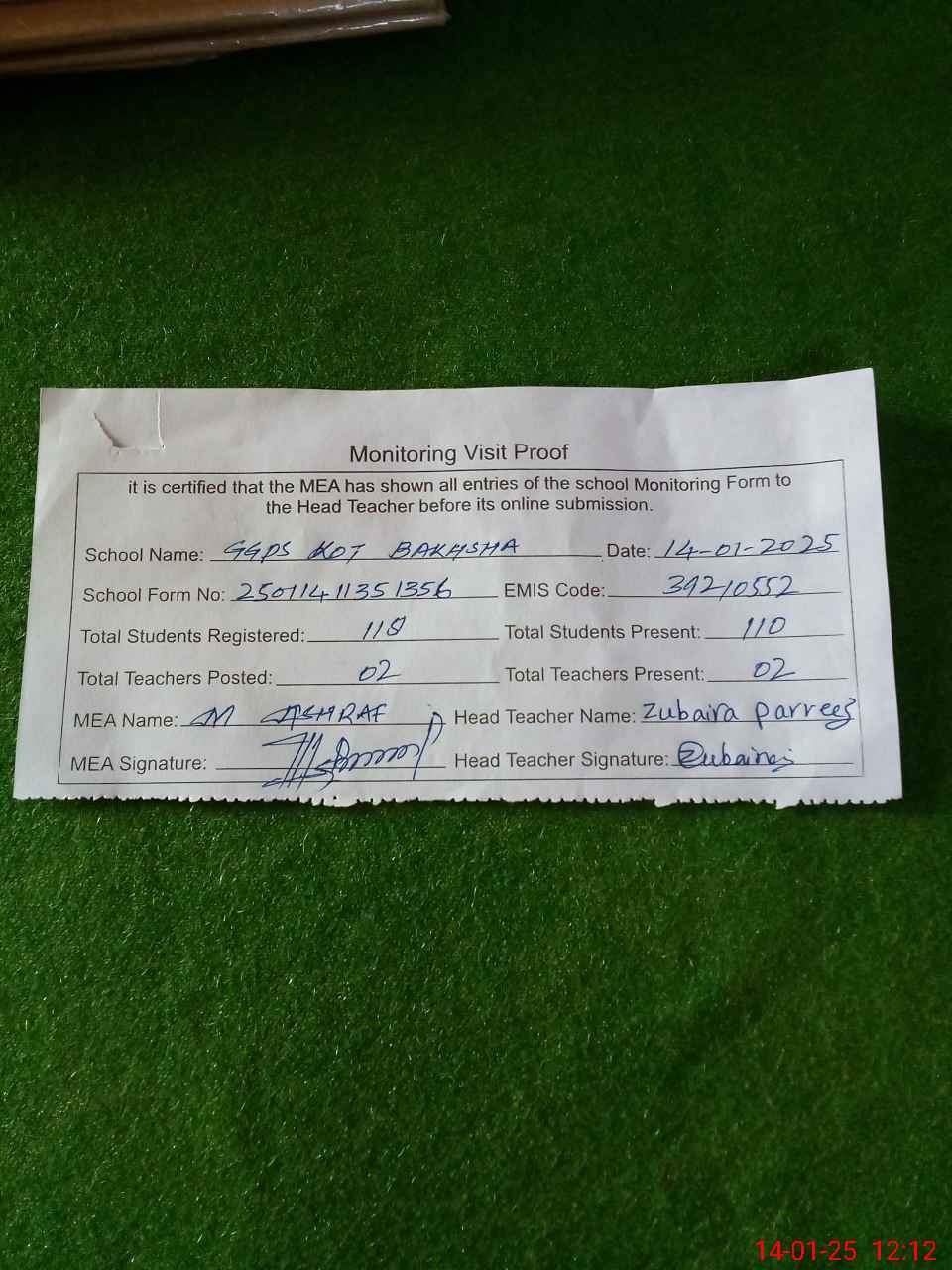 | Attendance Register | Head Teacher | MEA with School | Visit Proof |