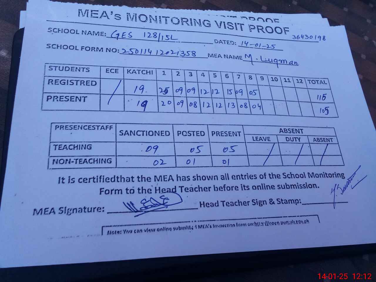 | EMIS Code: 36430198 | Name of School: GES 128/15-L, MIAN CHANNU | |||