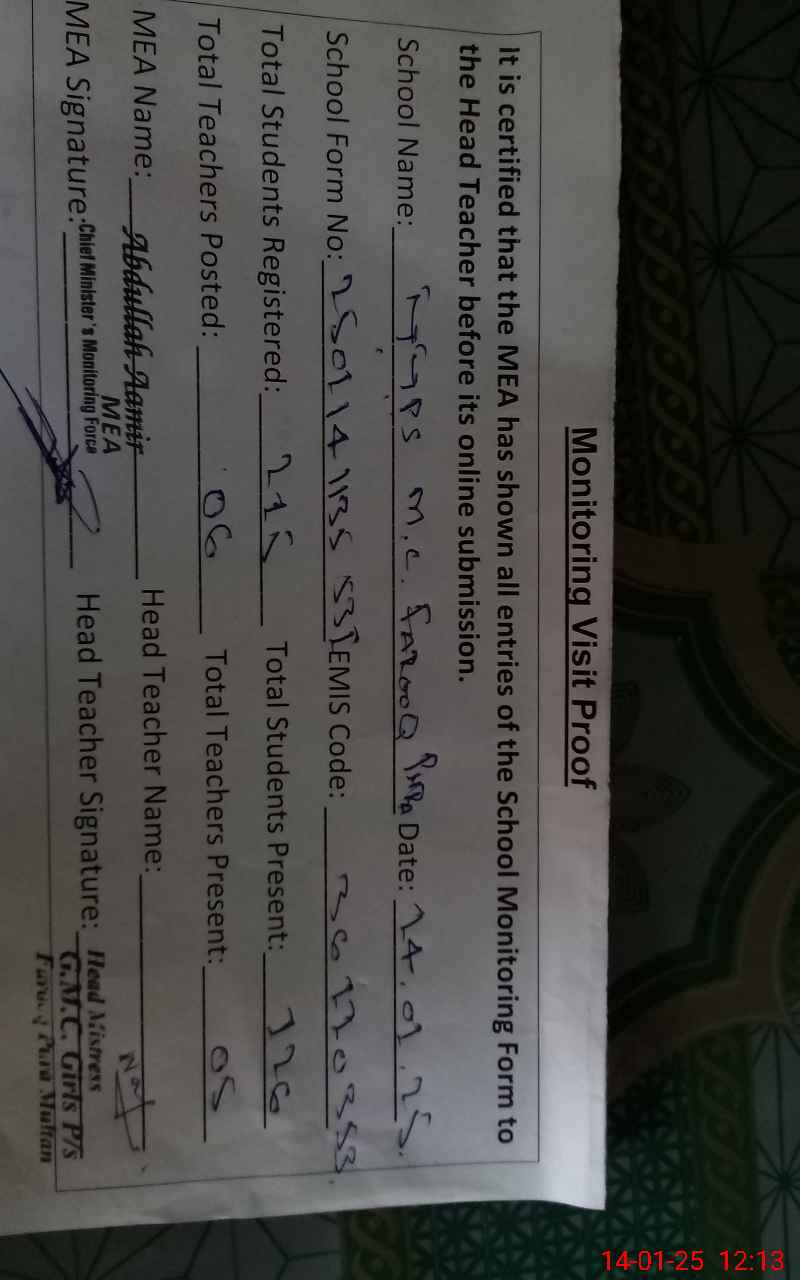 | EMIS Code: 36110353 | Name of School: GGPS MC FAROOQ PURA MULTAN | |||