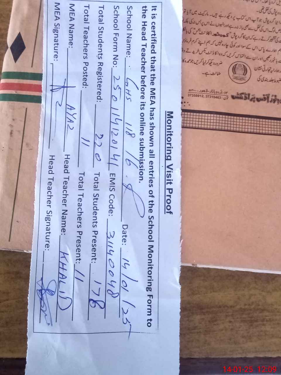 | Attendance Register | Head Teacher | MEA with School | Visit Proof |