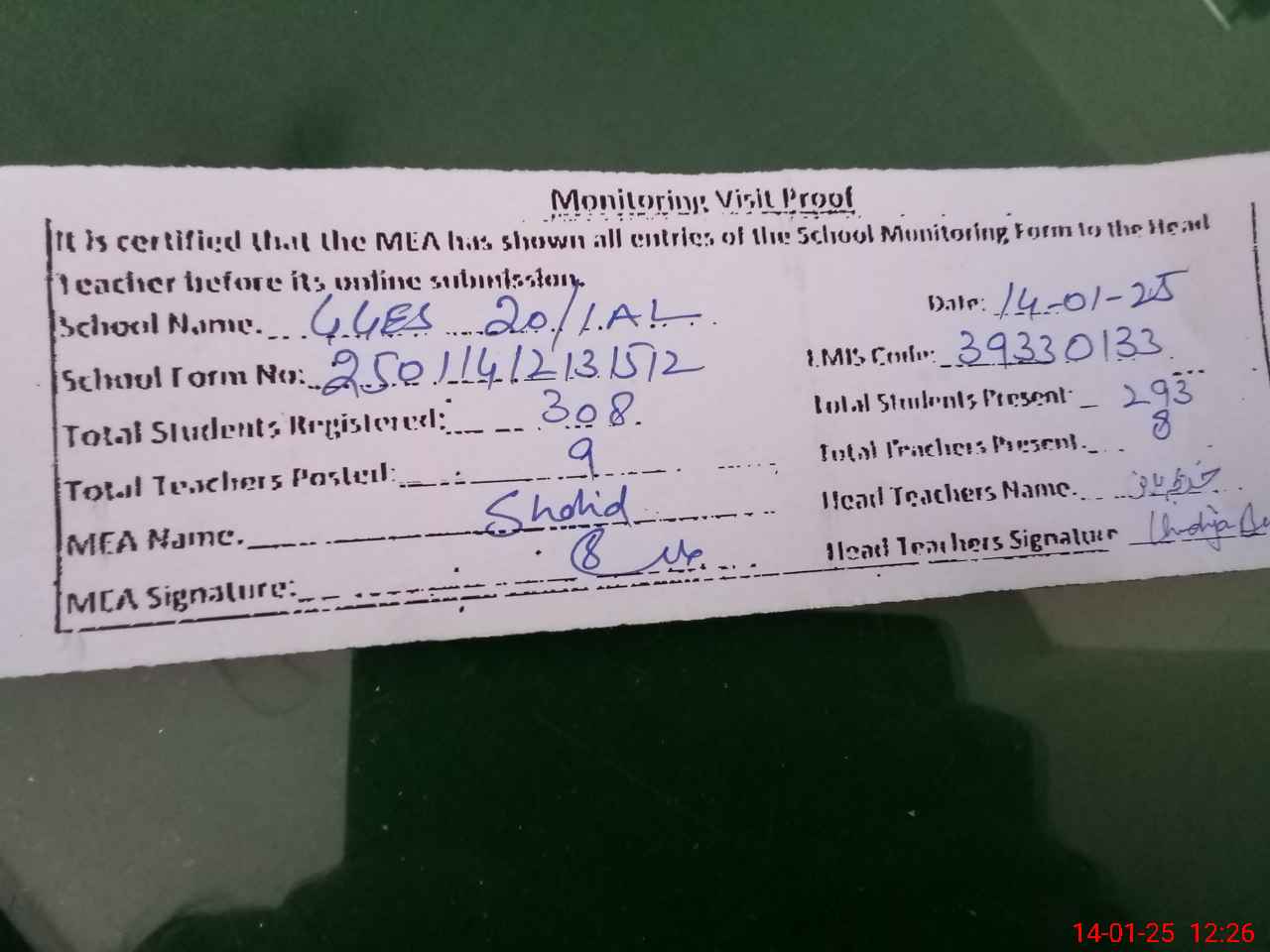 | Attendance Register | Head Teacher | MEA with School | Visit Proof |