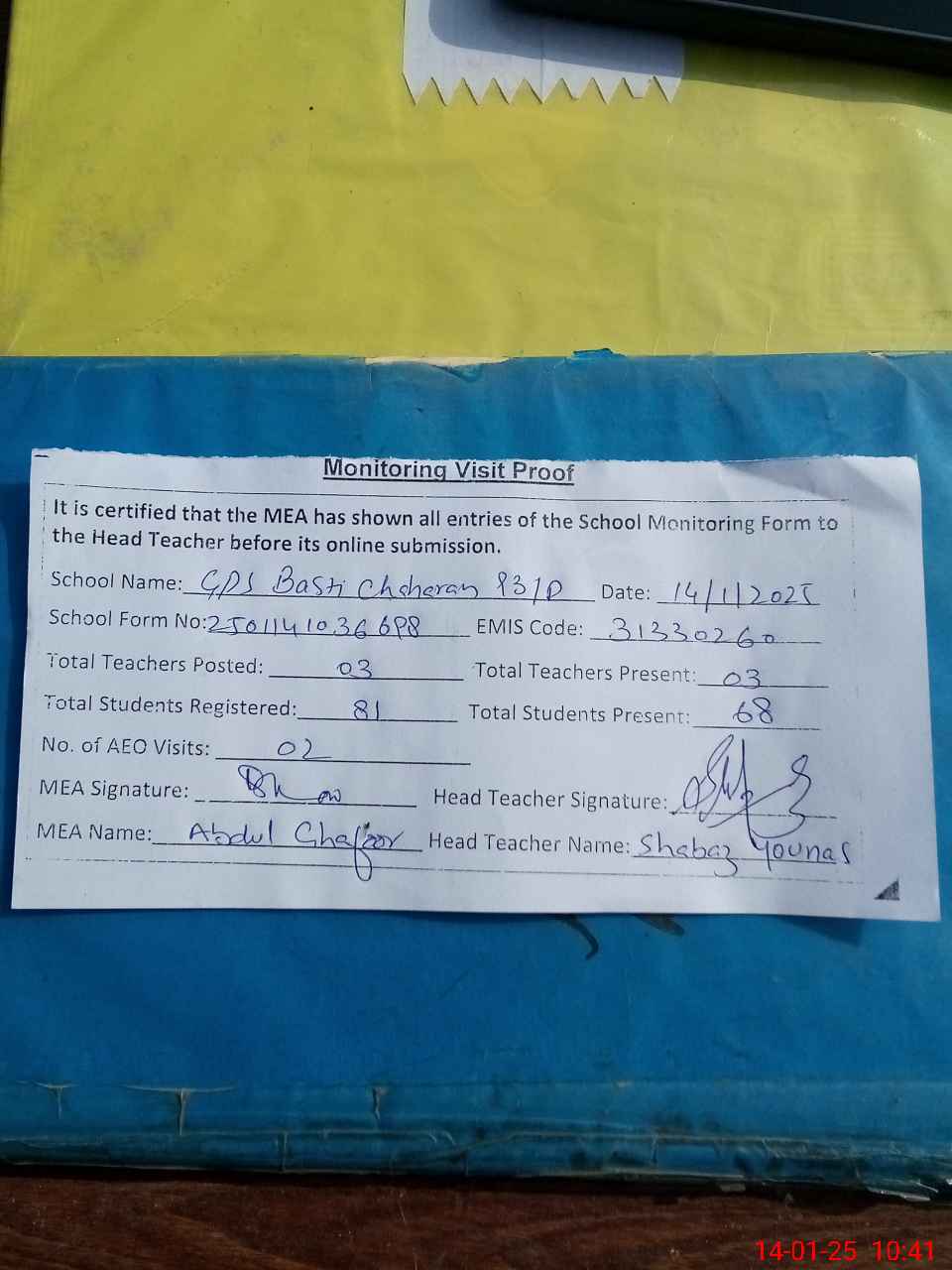 | EMIS Code: 31330260 | Name of School: GPS BASTI CHACHRAN 93/P | |||