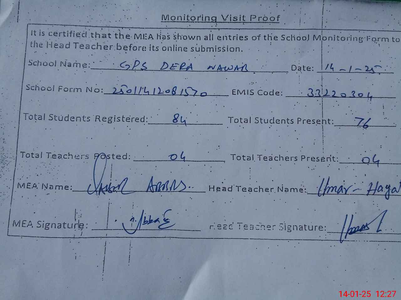 | Attendance Register | Head Teacher | MEA with School | Visit Proof |
