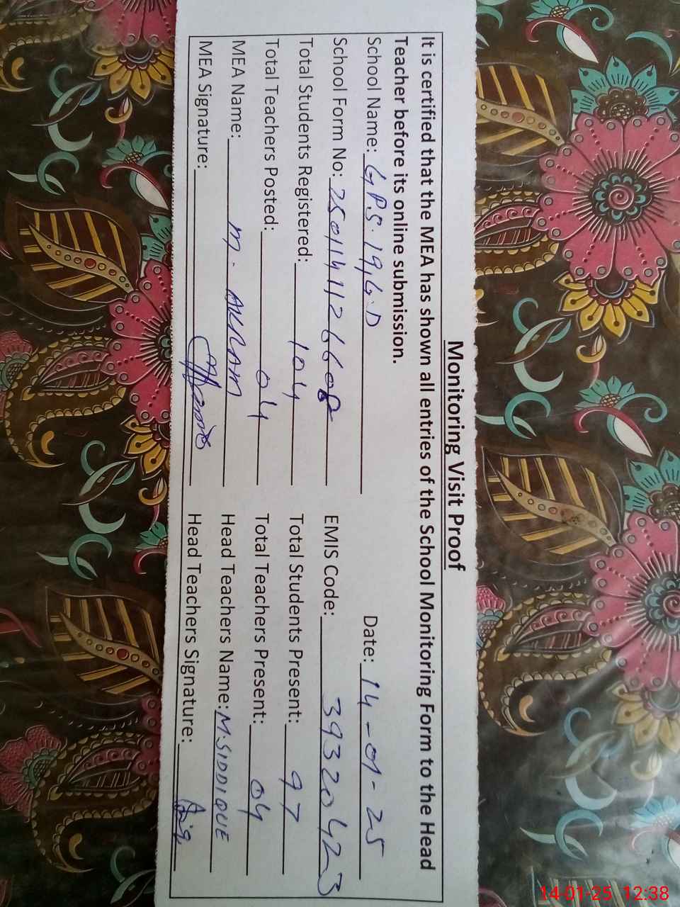 | Attendance Register | Head Teacher | MEA with School | Visit Proof |