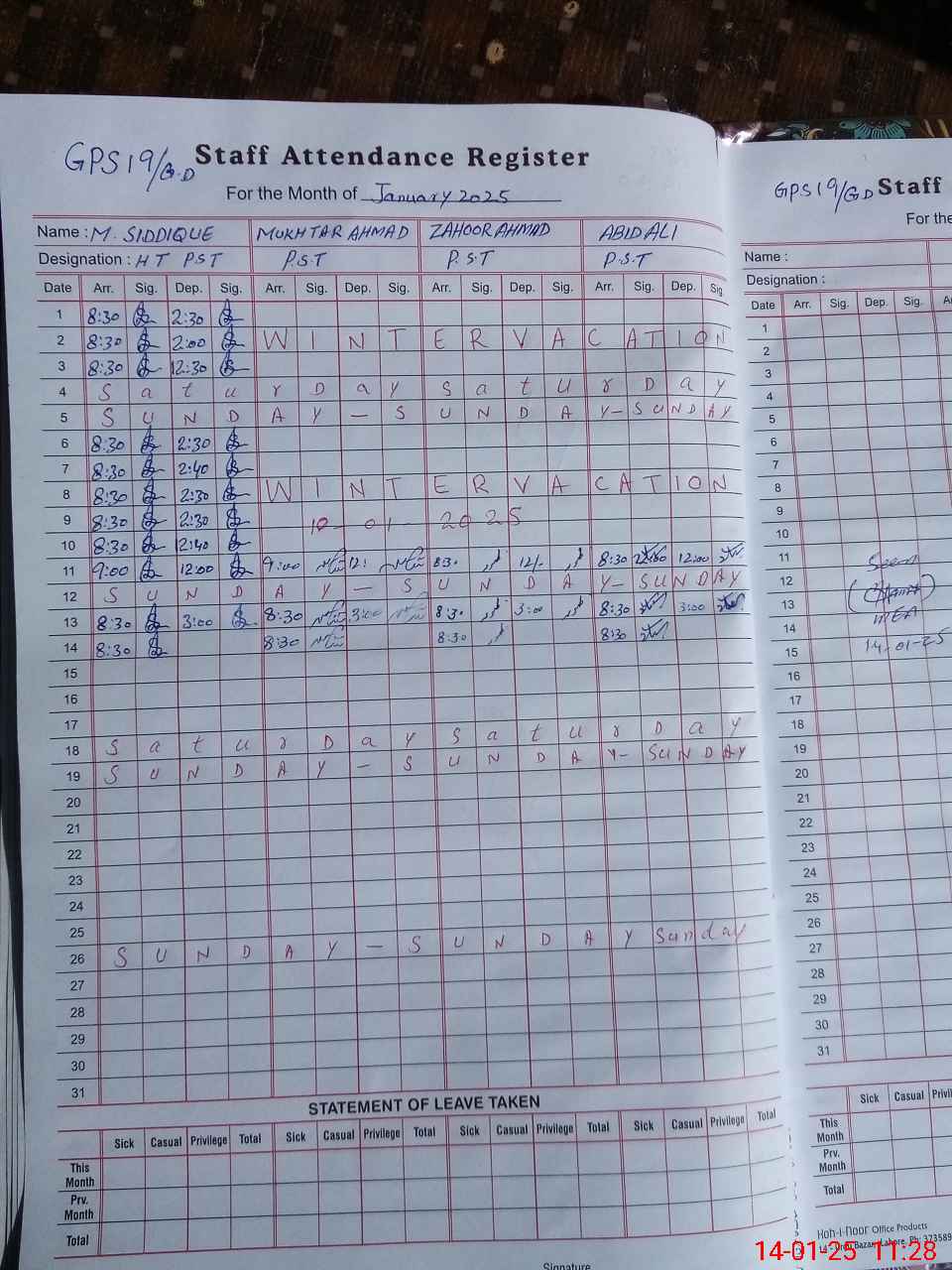 | CNIC | Full Name | Designation | R/C | Absence During Last Calender Month |