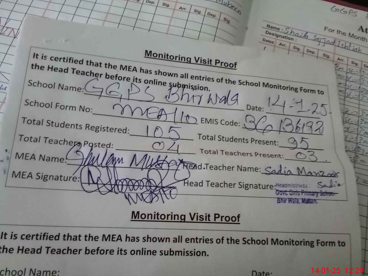 | Attendance Register | Head Teacher | MEA with School | Visit Proof |