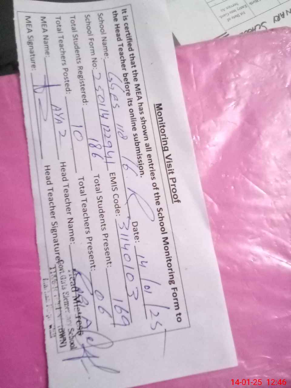 | Attendance Register | Head Teacher | MEA with School | Visit Proof |