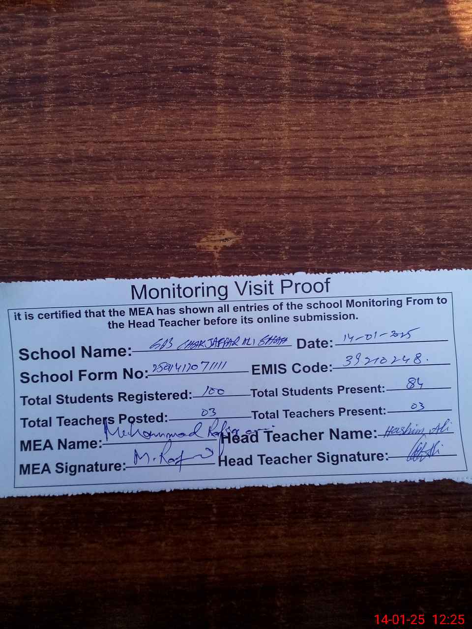 | Attendance Register | Head Teacher | MEA with School | Visit Proof |