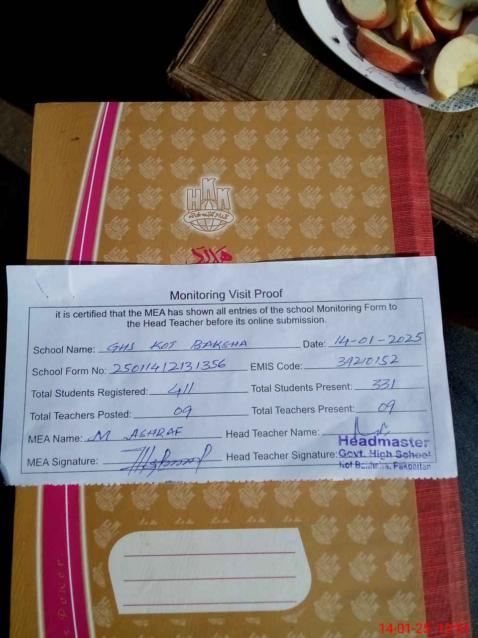 | Attendance Register | Head Teacher | MEA with School | Visit Proof |