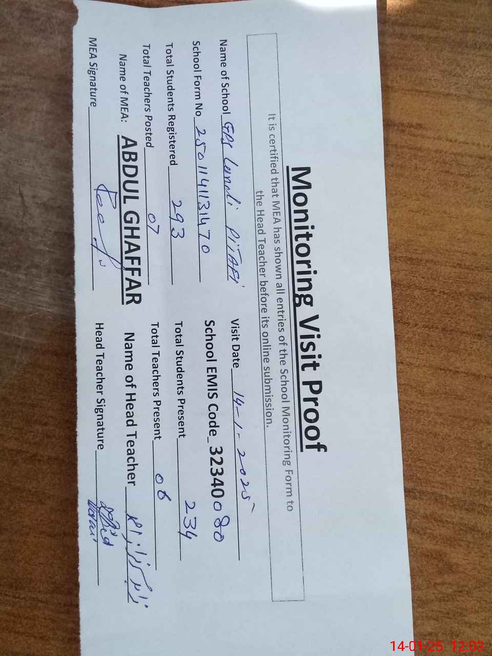 | Attendance Register | Head Teacher | MEA with School | Visit Proof |