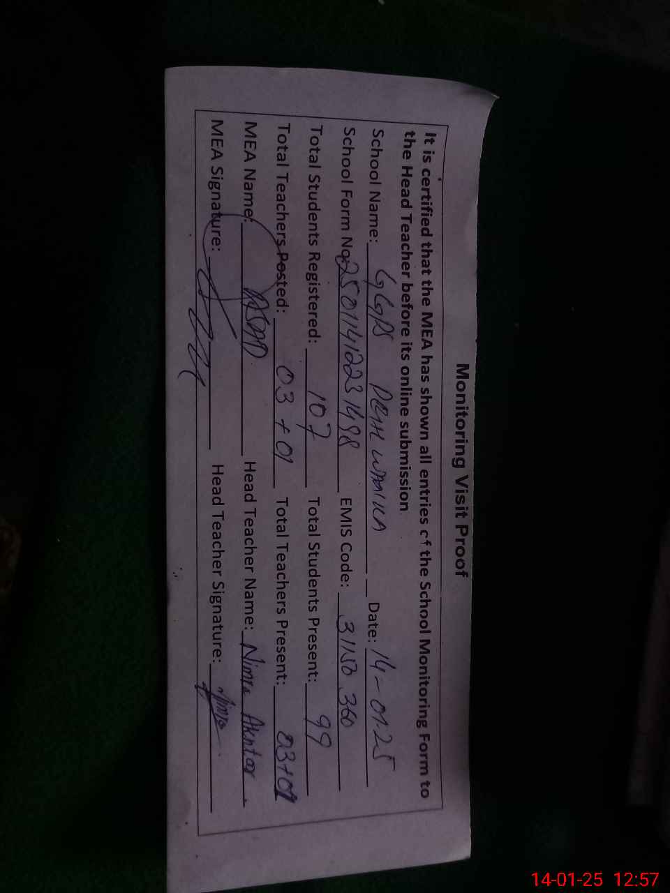 | Attendance Register | Head Teacher | MEA with School | Visit Proof |