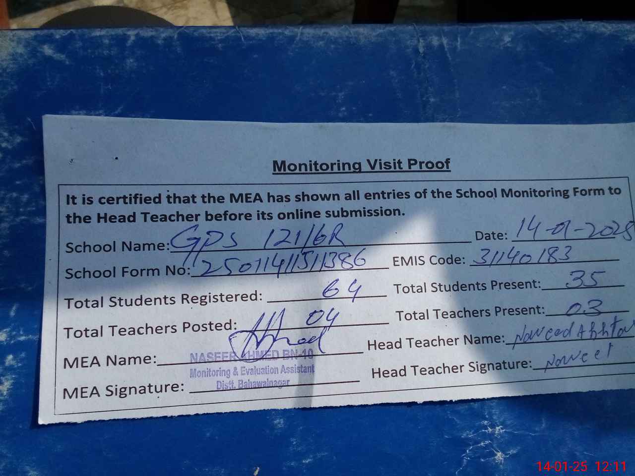 | Attendance Register | Head Teacher | MEA with School | Visit Proof |
