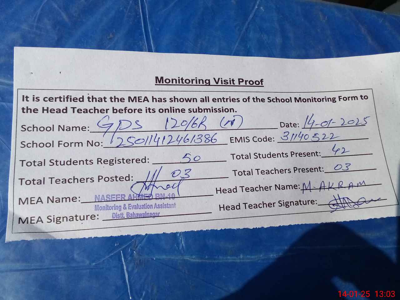 | Attendance Register | Head Teacher | MEA with School | Visit Proof |