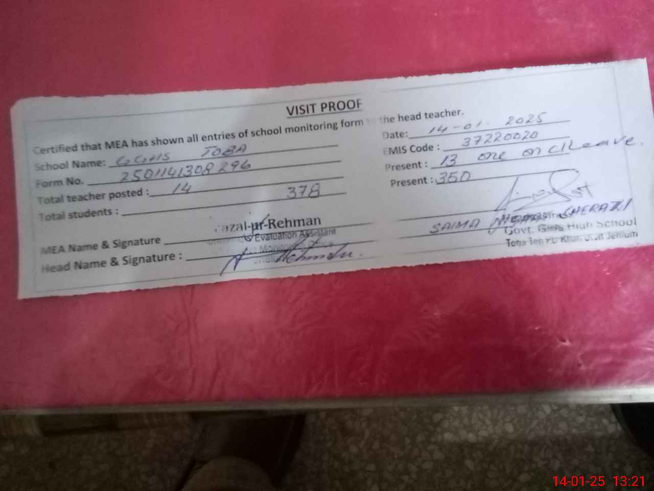 | Attendance Register | Head Teacher | MEA with School | Visit Proof |