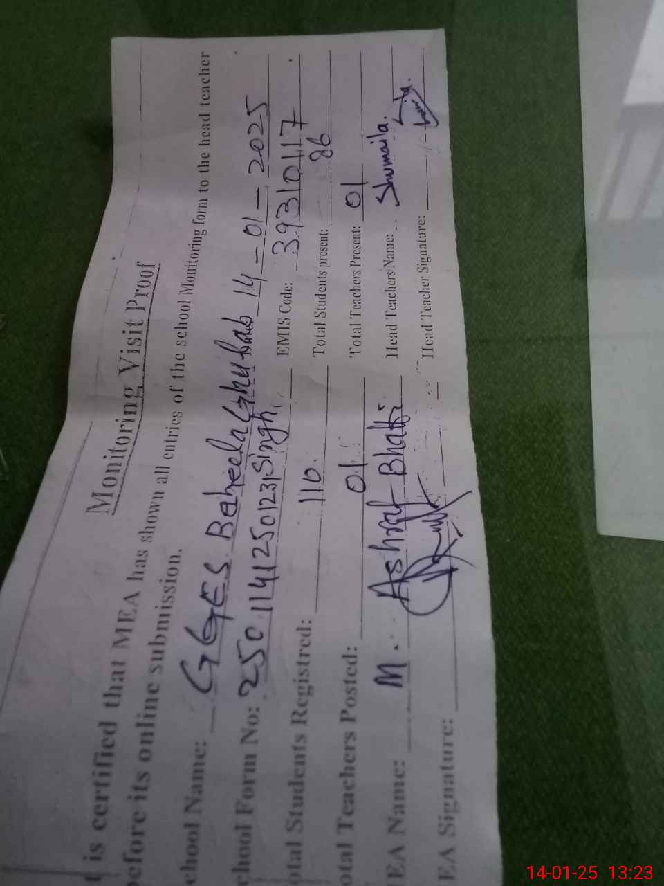 | Attendance Register | Head Teacher | MEA with School | Visit Proof |