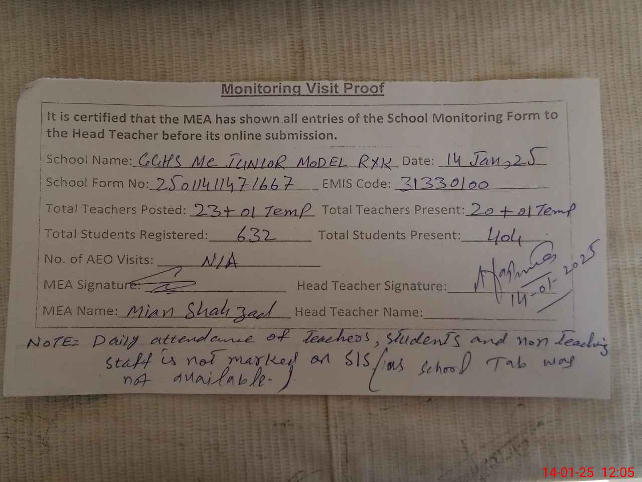 | Attendance Register | Head Teacher | MEA with School | Visit Proof |