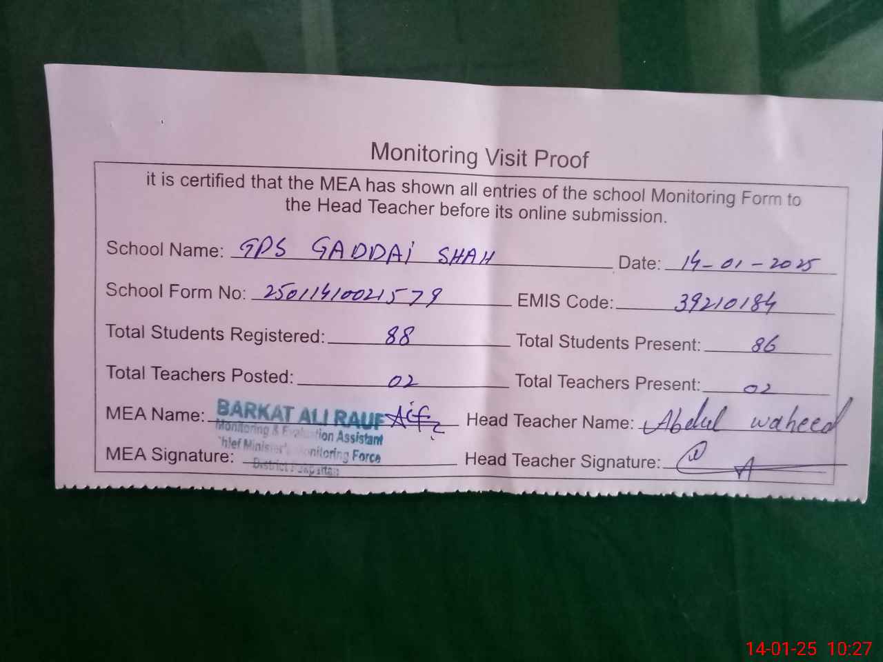 | EMIS Code: 39210184 | Name of School: GPS GADDAI SHAH PO PAKPATTAN | |||