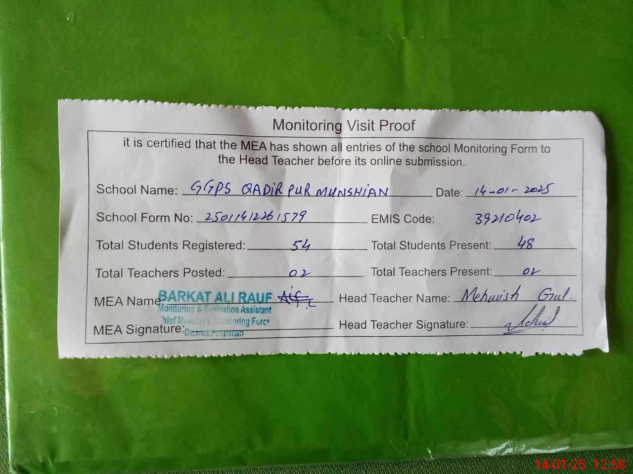 | EMIS Code: 39210402 | Name of School: GGPS QADIR PUR MUNSHIAN | |||