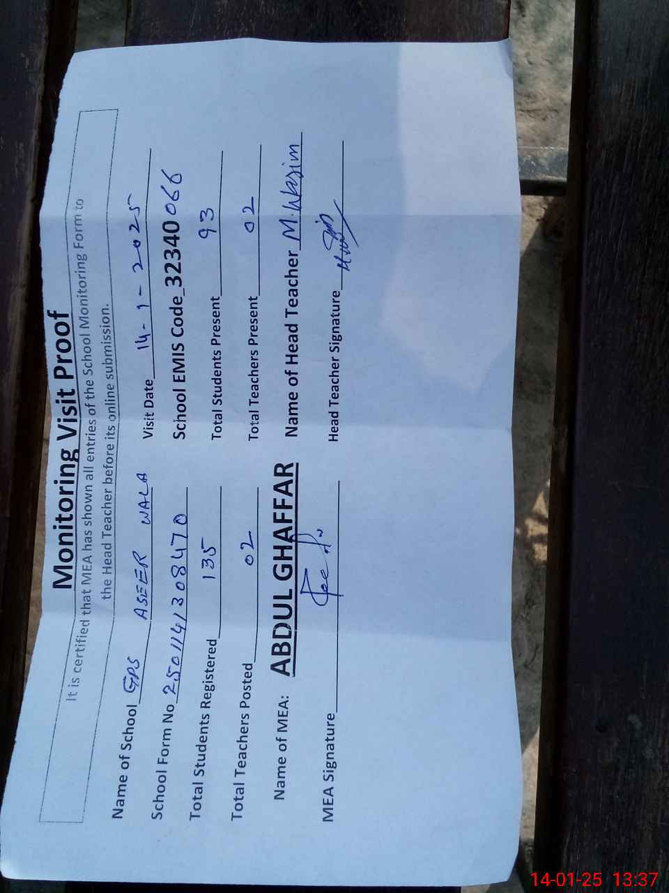 | Attendance Register | Head Teacher | MEA with School | Visit Proof |