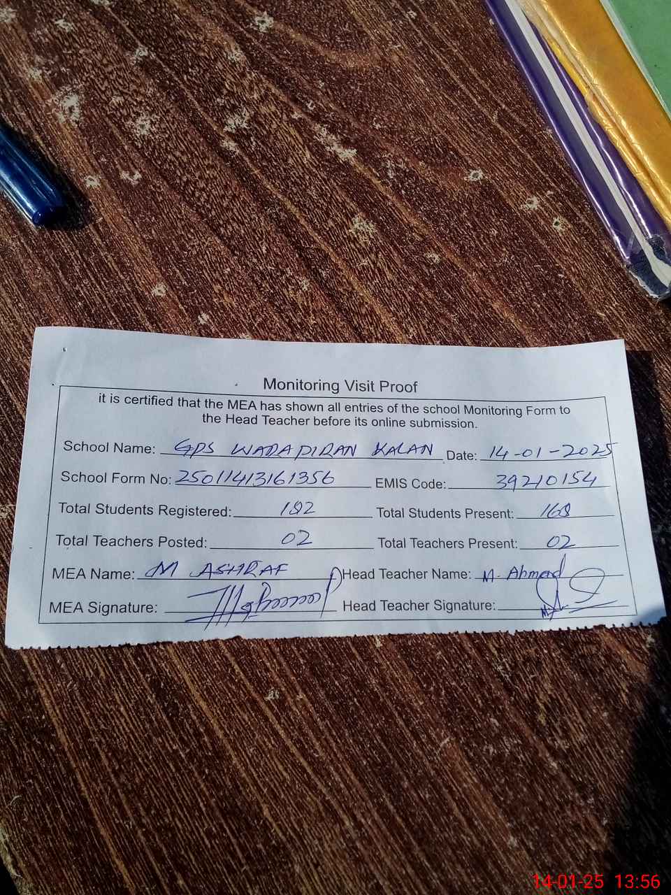 | Attendance Register | Head Teacher | MEA with School | Visit Proof |