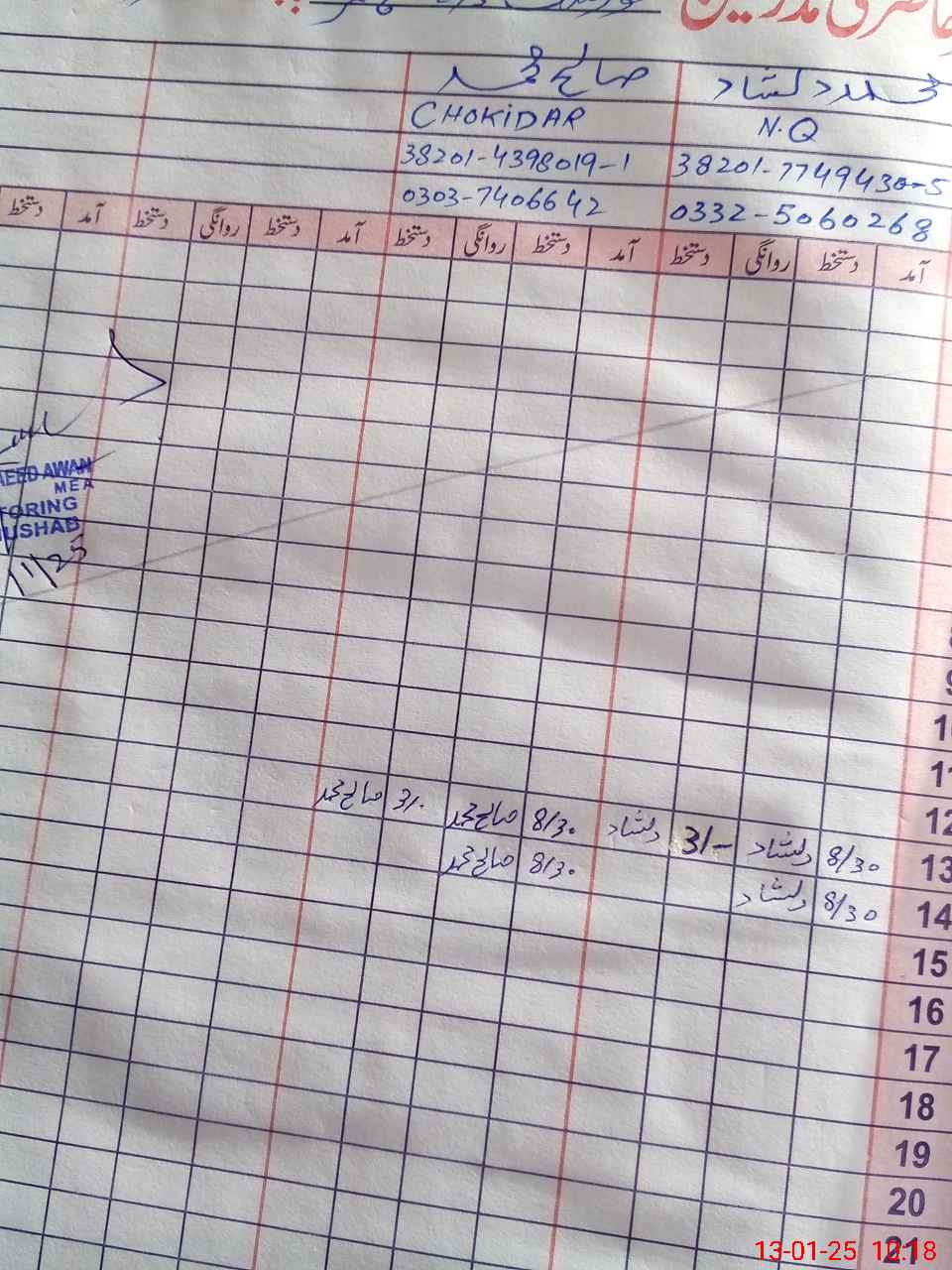 | CNIC | Full Name | Designation | R/C | Absence during last cal. month |