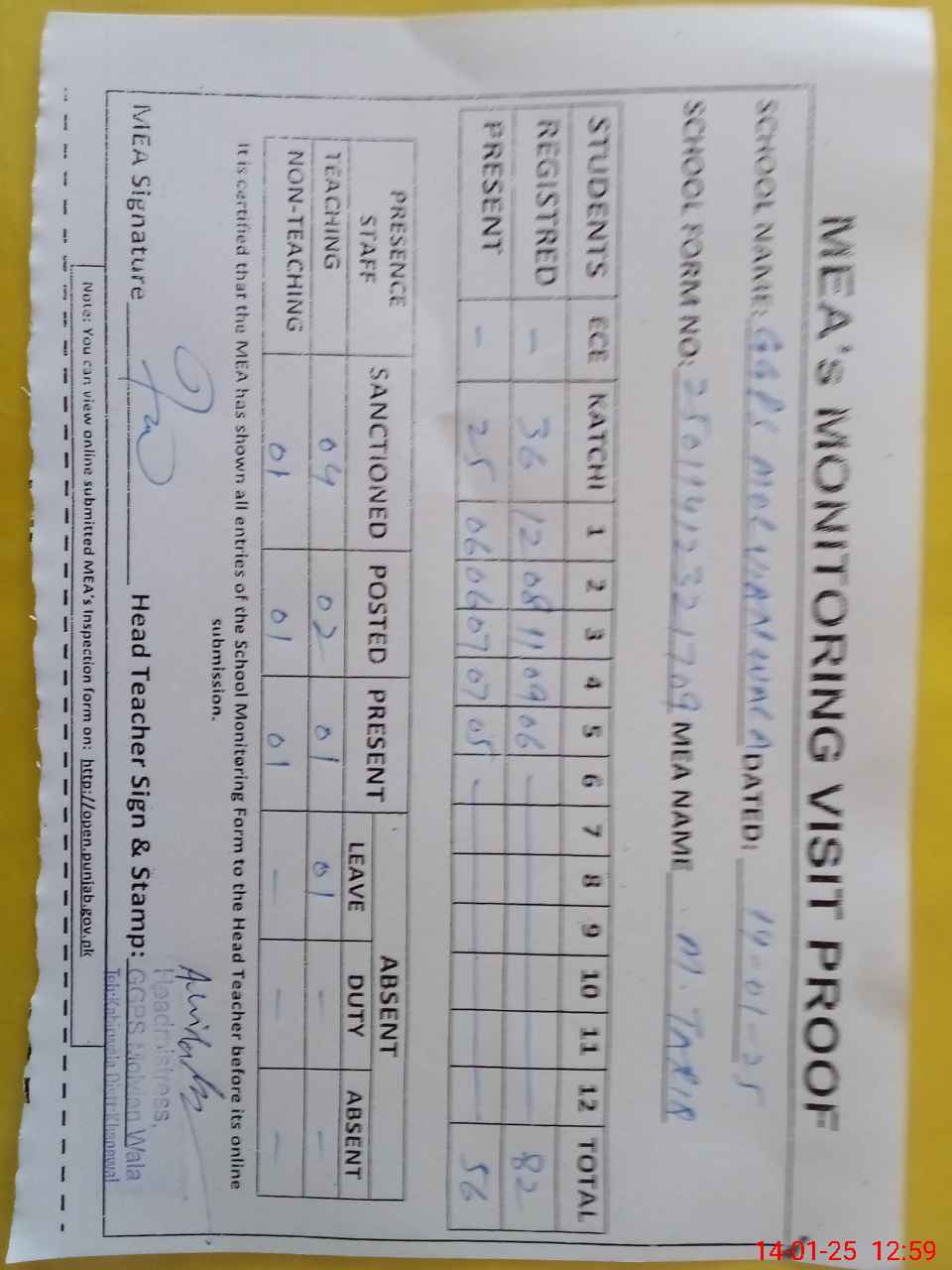 | Attendance Register | Head Teacher | MEA with School | Visit Proof |