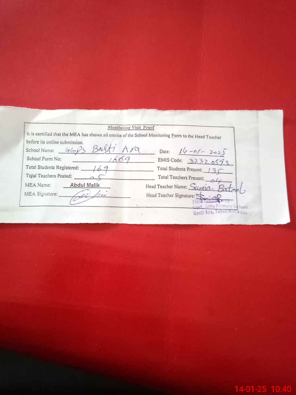 | Attendance Register | Head Teacher | MEA with School | Visit Proof |