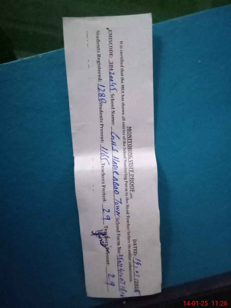 | Certified that this School was Inspected by the Undersigned MEA/DMO Today and the Information Stated Above is as Per Record. | |||||