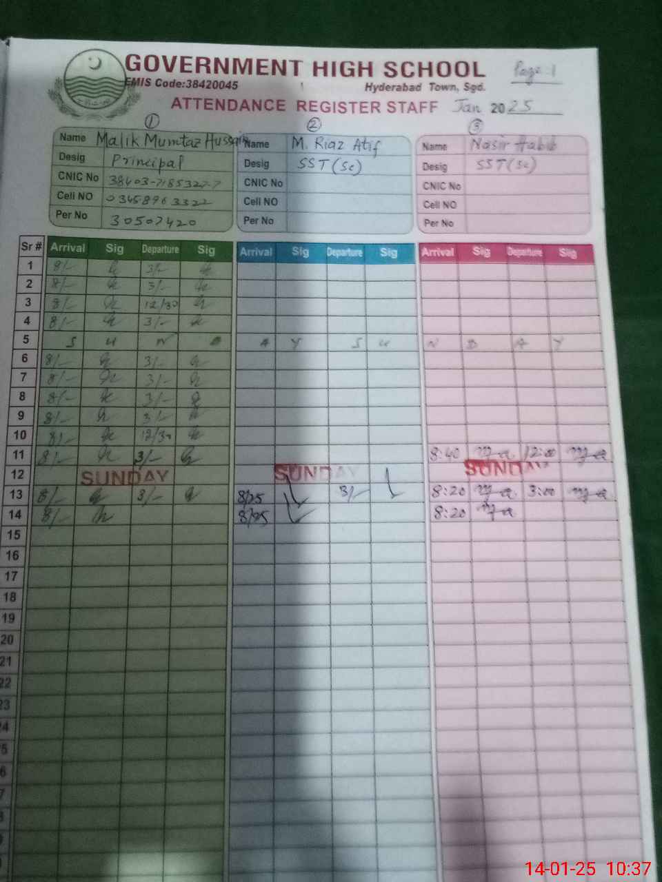 | CNIC | Full Name | Designation | R/C | Absence during last cal. month |