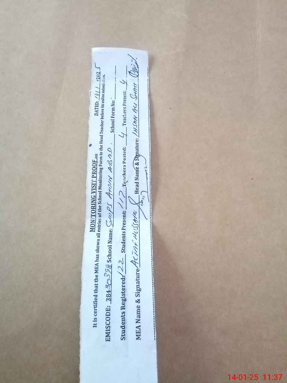 | Attendance Register | Head Teacher | MEA with School | Visit Proof |