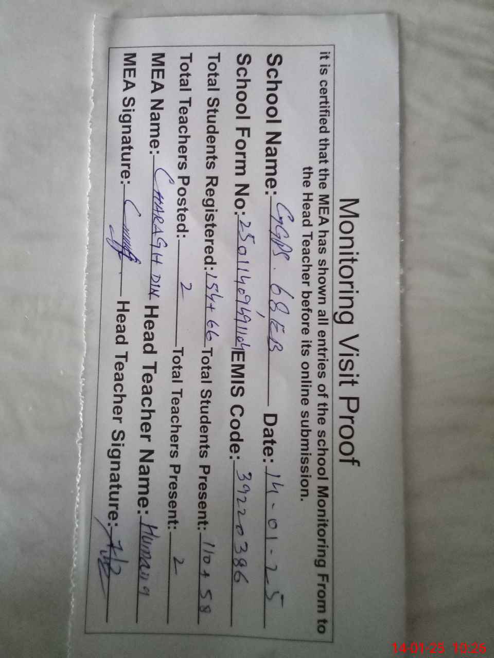 | Attendance Register | Head Teacher | MEA with School | Visit Proof |