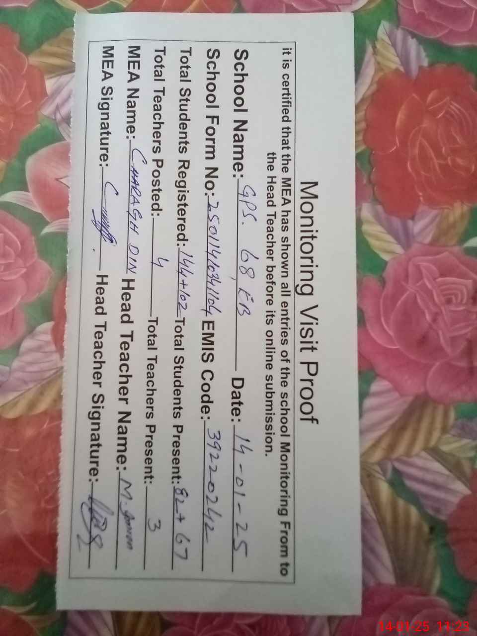 | Attendance Register | Head Teacher | MEA with School | Visit Proof |