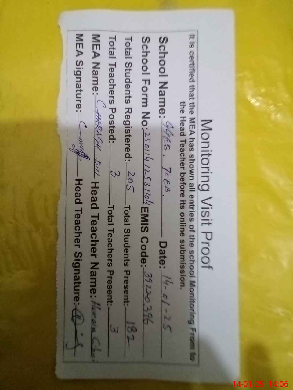 | Attendance Register | Head Teacher | MEA with School | Visit Proof |