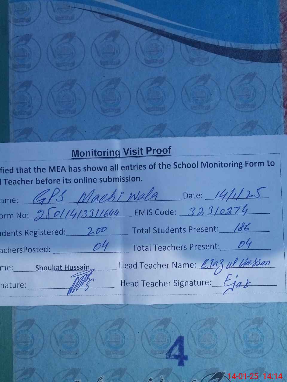 | Attendance Register | Head Teacher | MEA with School | Visit Proof |