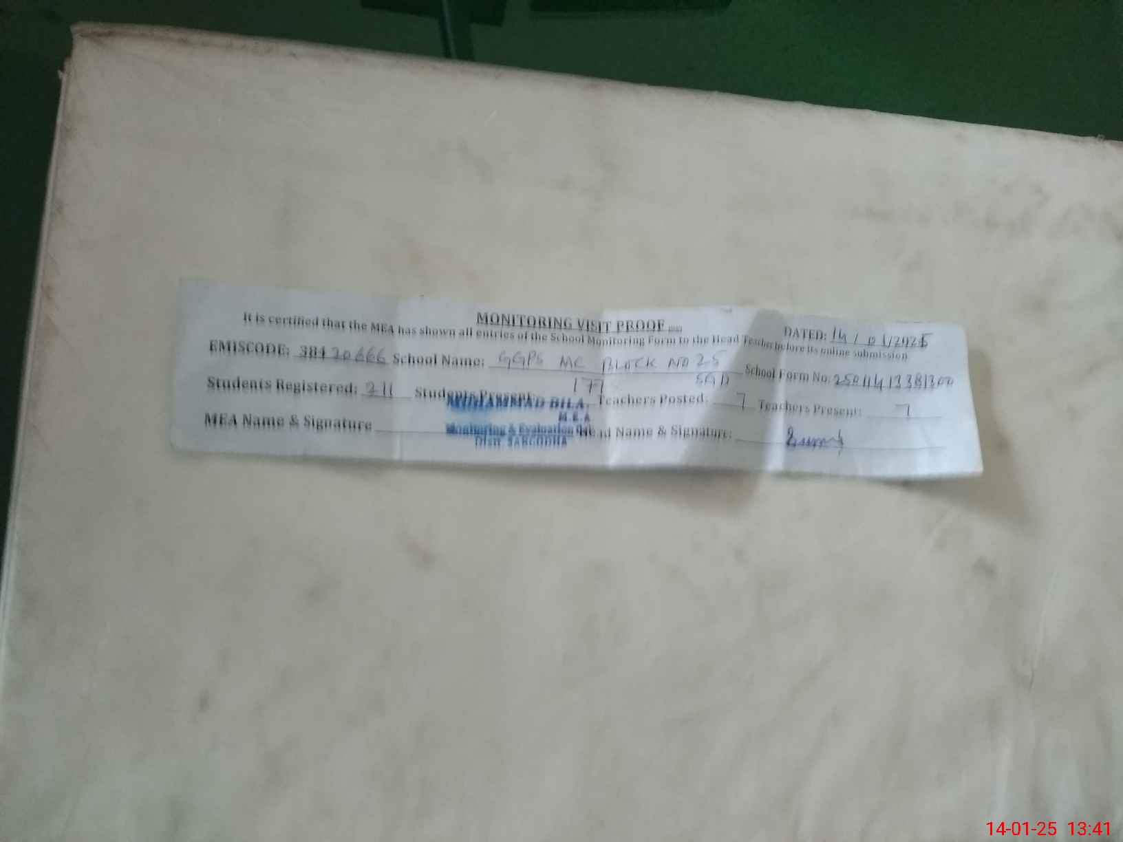 | Certified that this School was Inspected by the Undersigned MEA/DMO Today and the Information Stated Above is as Per Record. | |||||