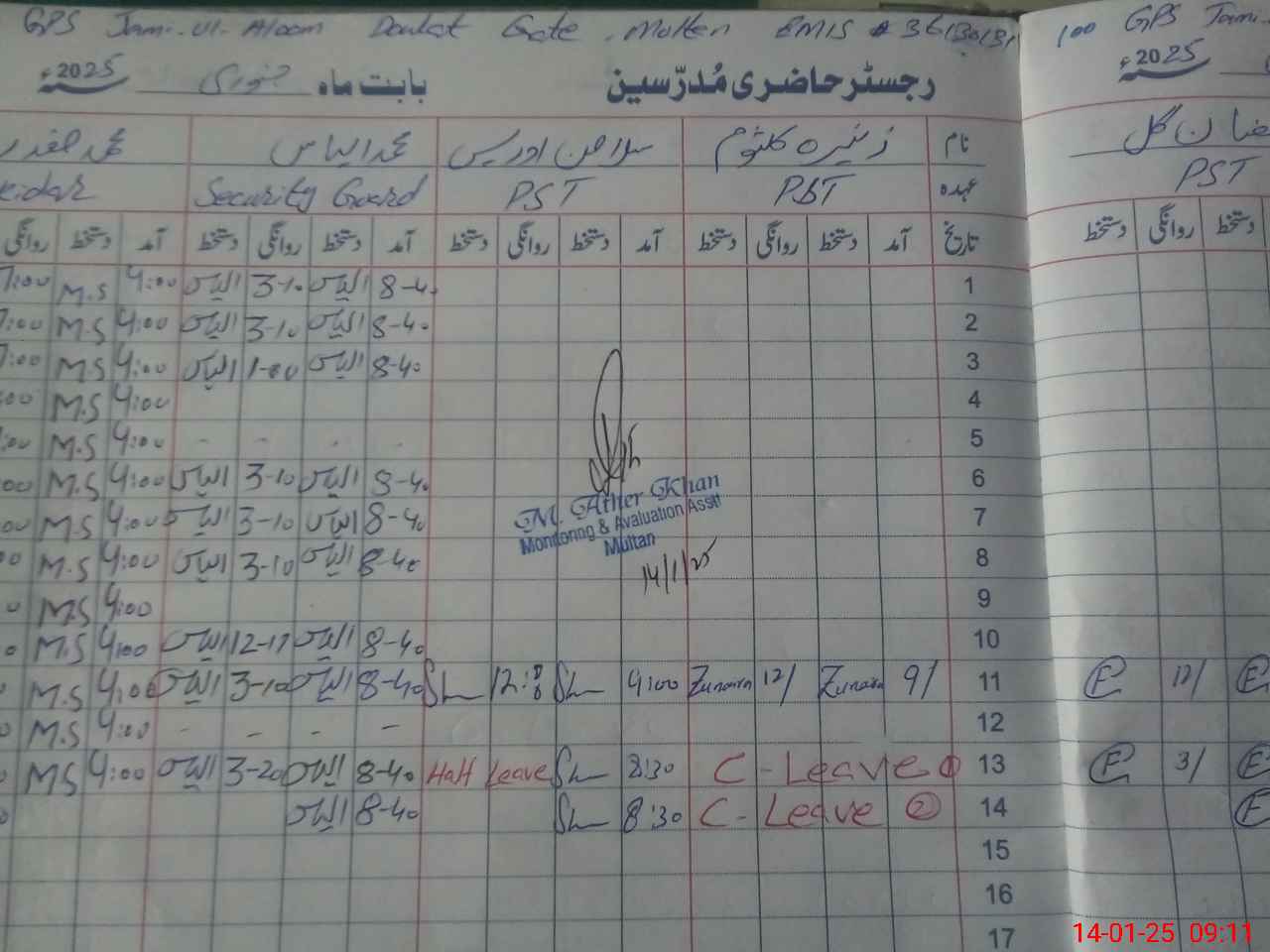 | CNIC | Full Name | Designation | R/C | Absence During Last Calender Month |