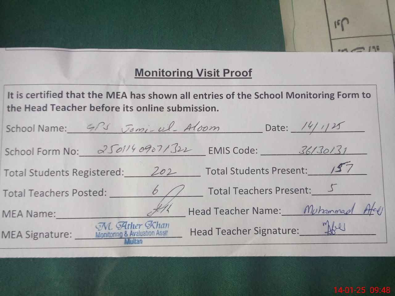 | Attendance Register | Head Teacher | MEA with School | Visit Proof |