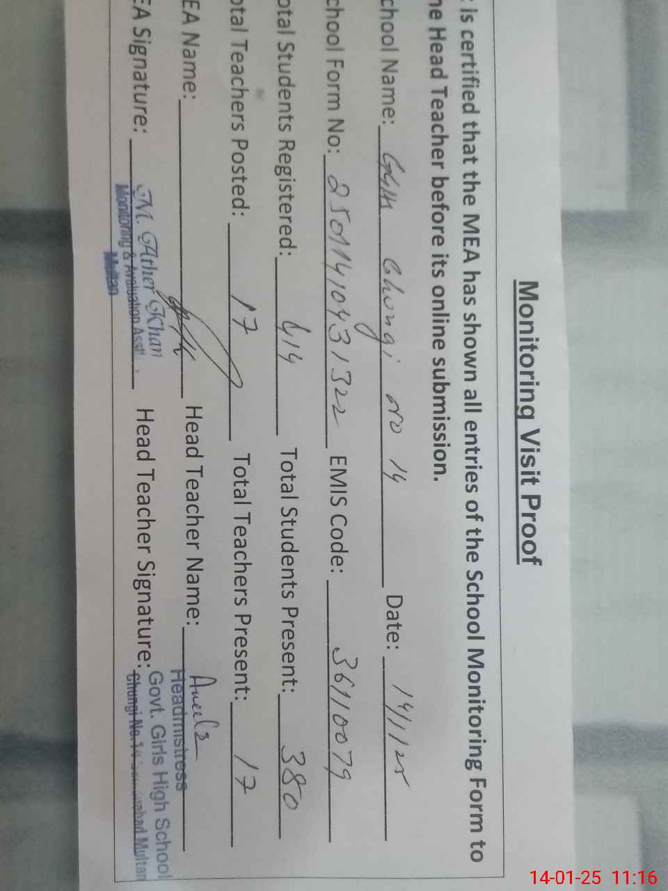 | Attendance Register | Head Teacher | MEA with School | Visit Proof |