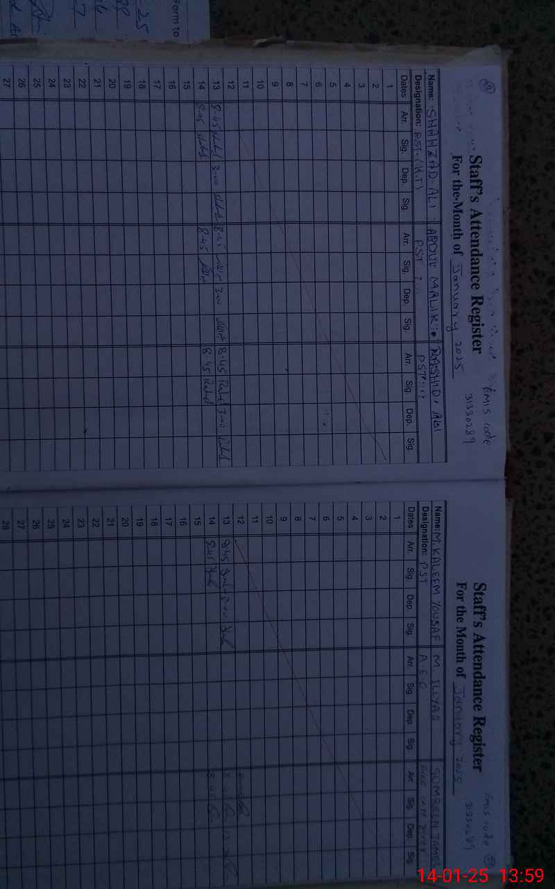 | CNIC | Full Name | Designation | R/C | Absence During Last Calender Month |