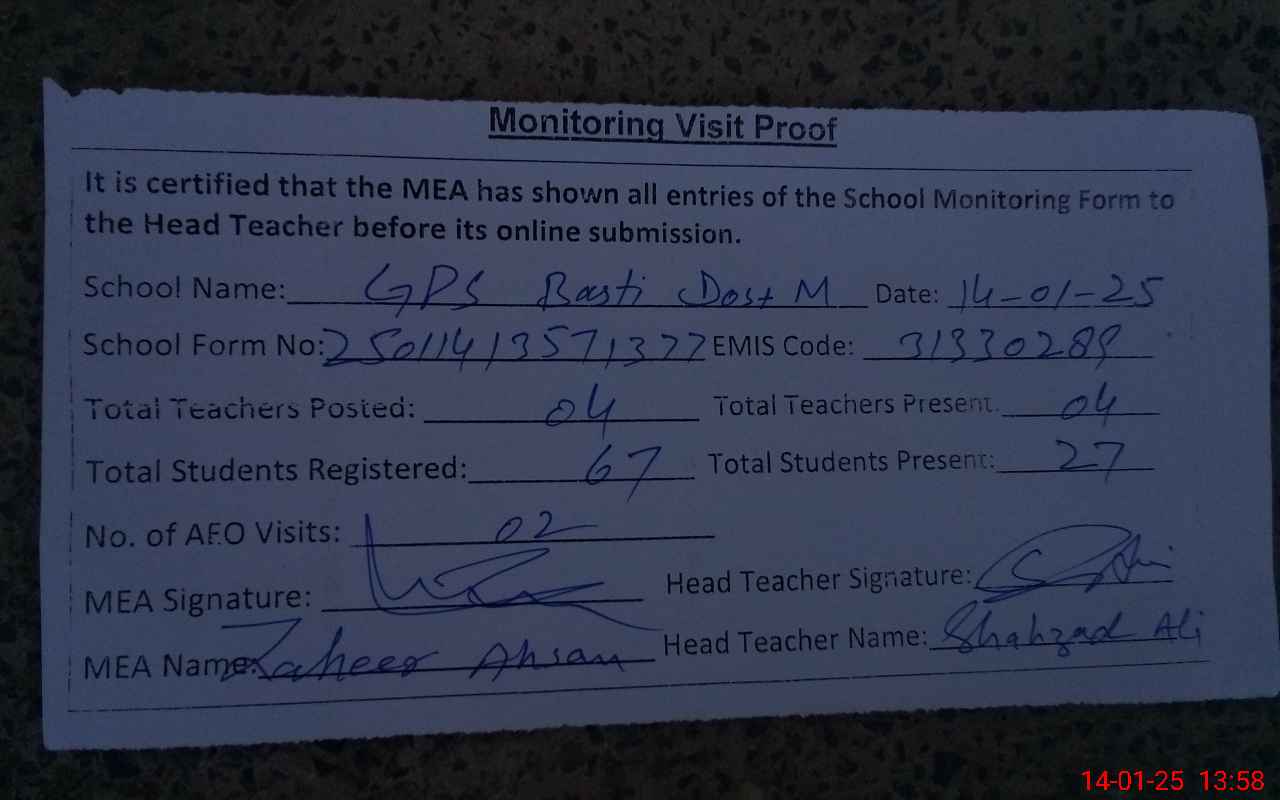 | EMIS Code: 31330289 | Name of School: GPS BASTI DOST MUHAMMAD | |||